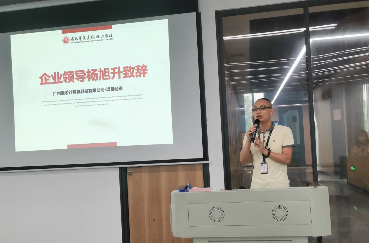 会议伊始,广州漫游计算机科技有限公司项目经理杨旭升致辞,他对本次项目取得的成果表示肯定,对学生认真负责的工作态度给予了高度评价,表达了后期企业愿引进更多实训项目,与校方携手共育高素质技能型人才的美好期望。