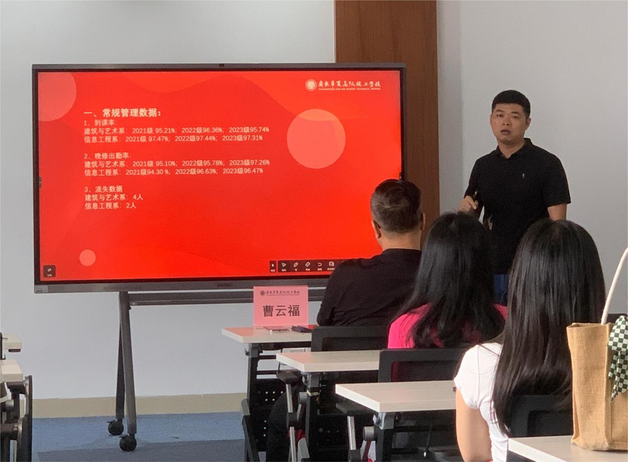 梁华君主任汇报学生德育管理工作情况,他指出,自开学以来,学校高度重视德育工作,经过全体师生的共同努力,德育工作已稳步有序地开展,取得了显著的成效。系部开展了一系列丰富多彩的德育活动,培养了学生们的社会责任感和奉献精神。他表示,未来系部将继续加强德育工作,不断创新德育方法和手段,为学生的全面发展和学校的持续发展奠定坚实的基础。