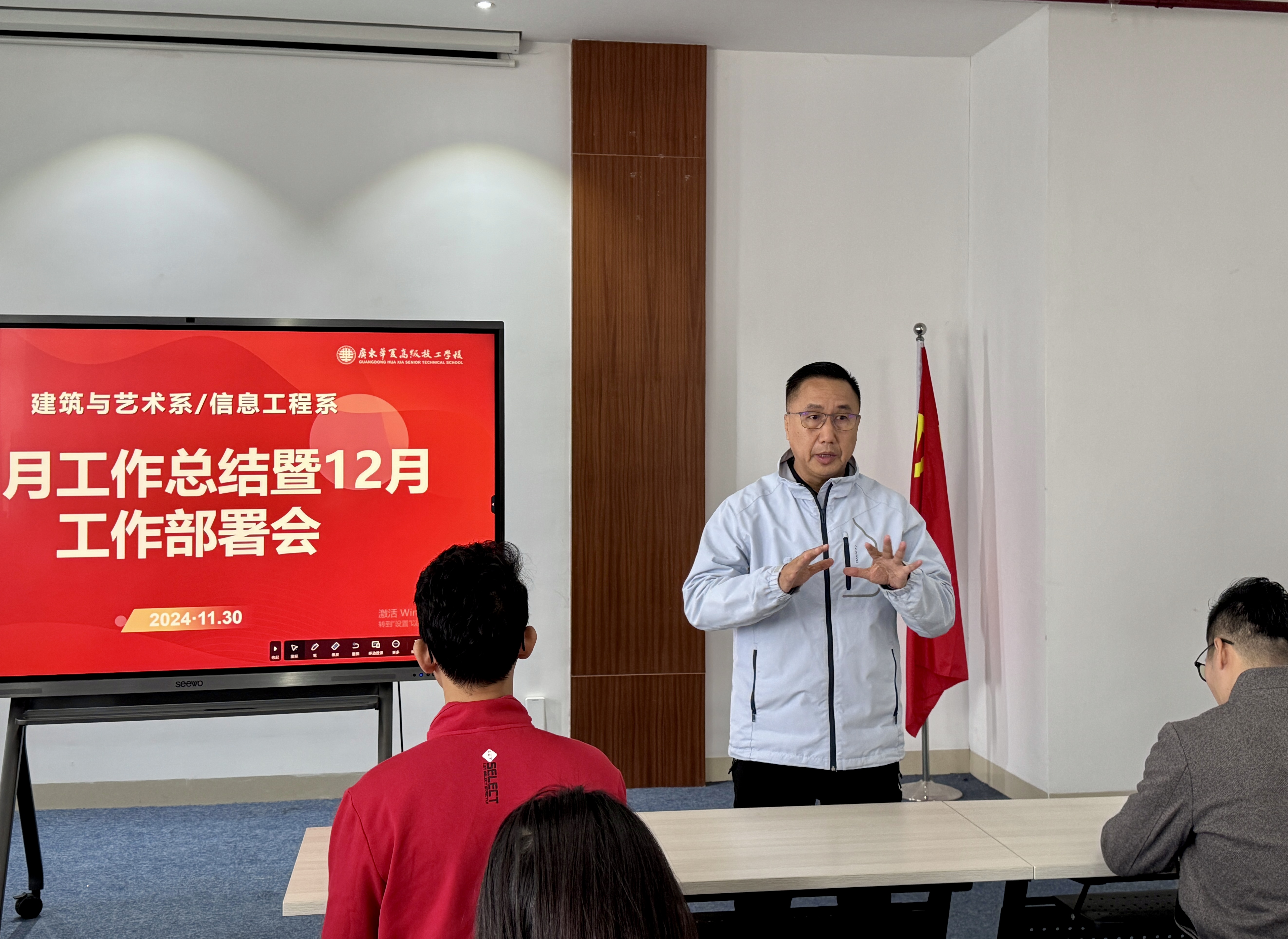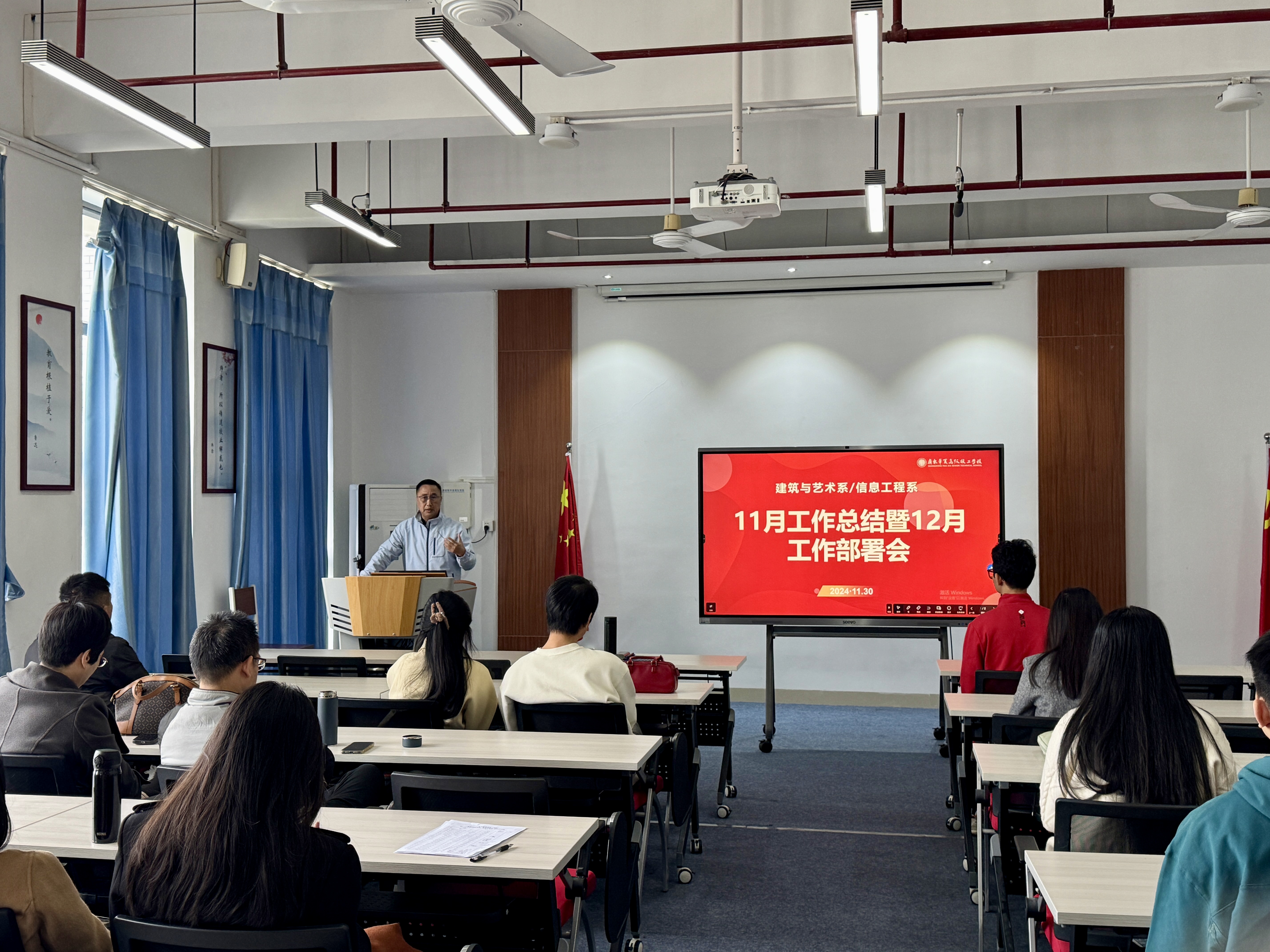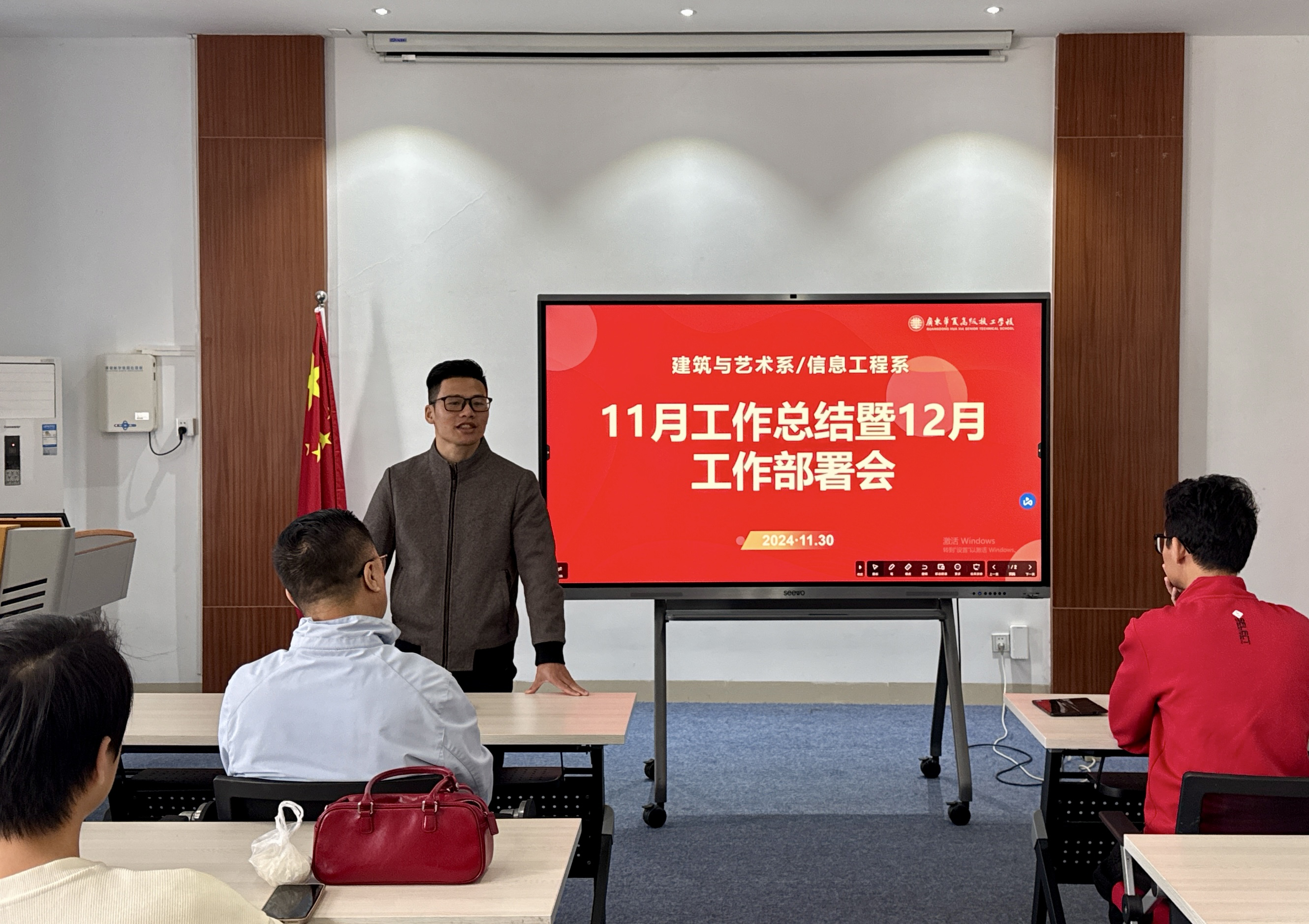 郑仕焯主任总结汇报了11月工作。他强调,按照学校和系部工作重点,建筑与艺术系、信息工程系11月协同推进、狠抓落实,各项工作有序推进,取得了阶段性的成果,肯定了各教研室的辛勤付出,也指出了目前存在的短板与痛点,并针对当前存在的问题提出了相应工作思路。