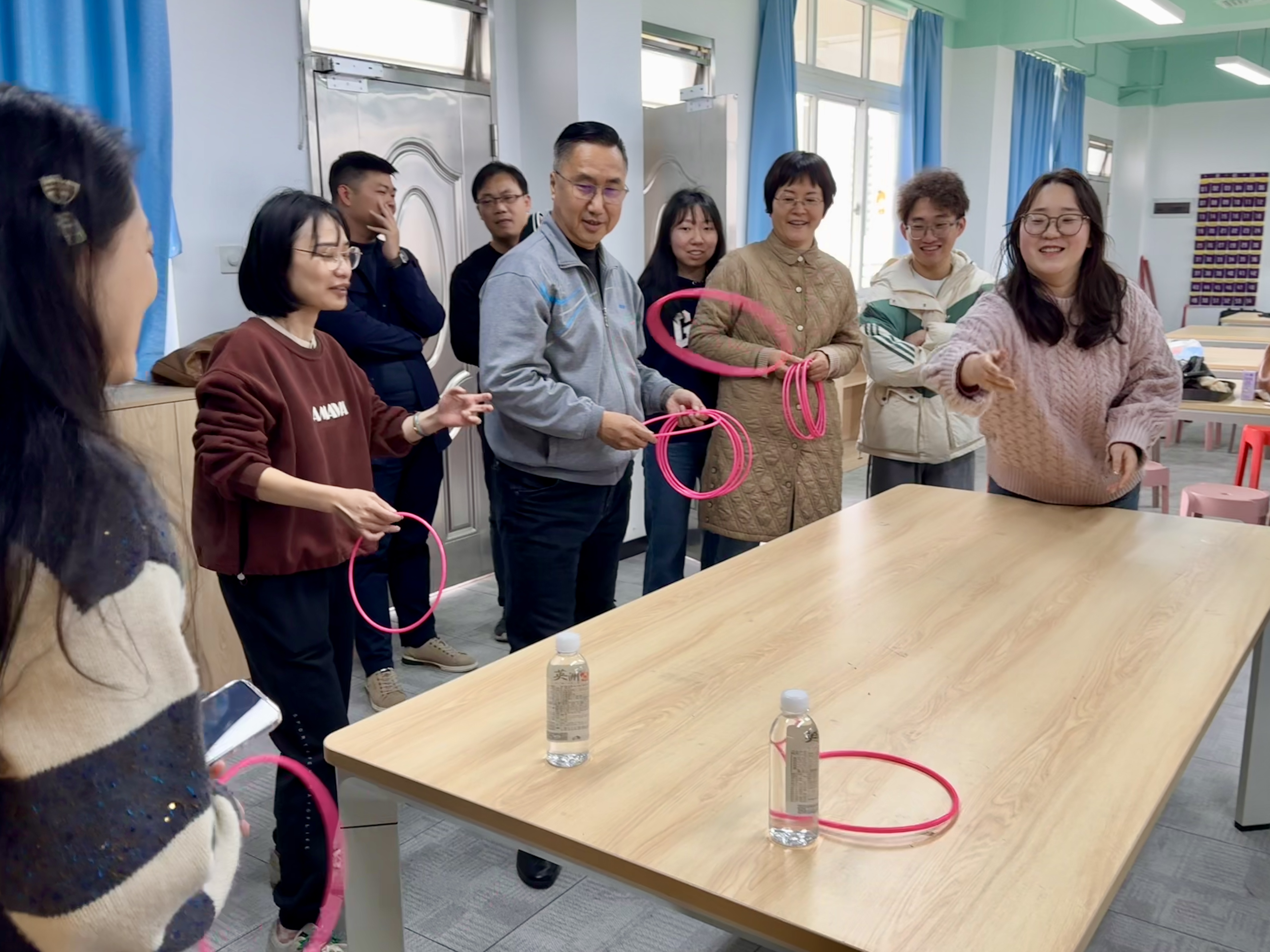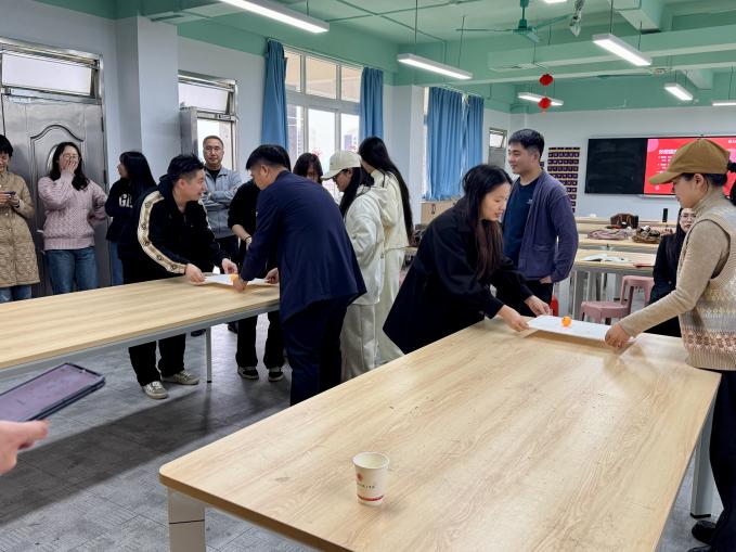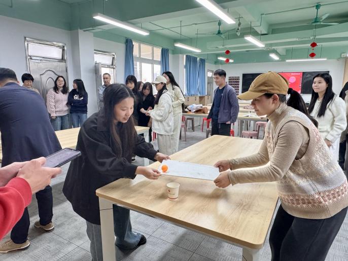 在第二个环节,会上组织老师们开展了和谐欢乐的系部团建活动,包括三项趣味横生的游戏:“幸运趣套圈”、“鲤鱼大翻身”和“纸运乒乓球”。团建活动增强了全体教职工的向心感和凝聚力,提升教师们的职业归属感和幸福感。