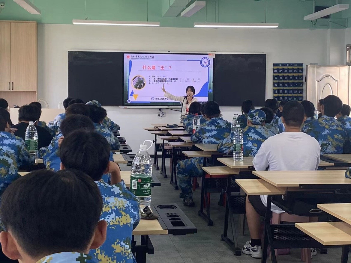 骨干教师方俊婷,用“王”字笔画蕴涵的哲学,演变出的“三”、“土”、“干”、“工”四字,充分解答了“如何学习专业课”的问题,告诫学生要虚心学习,脚踏实地,认真干活,一丝不苟,这样的人才有可能成为王,培养和建立了新生正确的价值取向,从而解决新生的思想困惑。